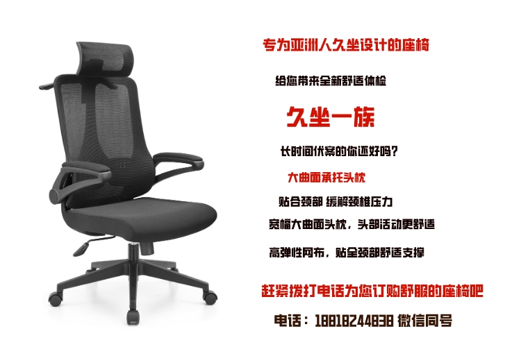 材质说明:1.网布:采用高级双层网,回弹性好 2.座布:采用高级弹力网布。手感细腻,舒适柔软 3.背筐:采用全新尼龙加纤料,抗老化,添加防寒剂零下10度以下不爆裂 4.头枕:采用全新白色尼龙加玻纤头枕,可上下升降 带高承重挂衣架 电镀装饰盖 5.海绵:采用高密度原生海绵 多成高密度棉叠加,柔软舒适,回弹力强 6.木板:采用1.5厚,为多层曲木板齿接热压成型弯板 7.底盘:采用2.5MM中班蝴蝶底盘,逍遥倾仰8 8.扶手:采用提拉扶手,海绵接触,舒适柔软,轻松收纳,节省空间 9.气杆:采用过SGS检测三级气杆、行程100MM,下沉60MM 10.脚架:采用320白色PP塑胶脚 11.轮子:采用50MM黑色静音PU轮 12.配有固定腰靠.顶腰护腰、高13CM。长40CM