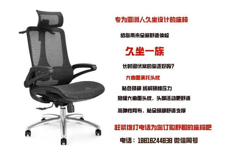 材质说明:1.靠背:尼龙背框,挺腰设计.呵护腰椎,久坐不累 2.头枕:升降活动头枕,配挂衣架胶条 3.坐垫:网座带40高密度定型绵,不添加粉、尼龙框架坐垫,全镂空设计,坐感舒适 4.网布:采用进口特网,坚韧耐磨,回弹性好 5.扶手:采用摆动扶手,带西皮扶手面,舒适耐用,扶手可翻起 省空间 适合家用办公一体 6.底盘:采用2.5mm厚的双手柄,任意可趟底盘 7.气杆:采用过SGS检测三级气杆.下沉80MM,行程100MM 8.五星脚:350精抛电镀脚。承载力强,抛光电镀,不易生锈 9.轮子:60mm白边静音万向轮 美观大气静音 10.配有固定腰靠.顶腰护腰、高13CM。长40CM